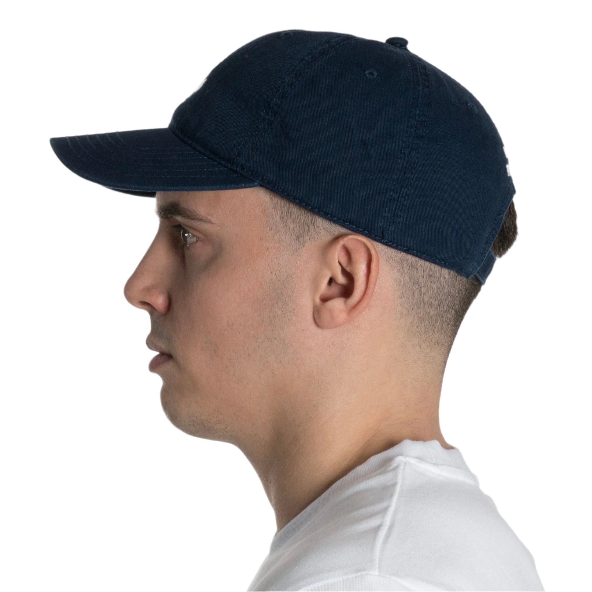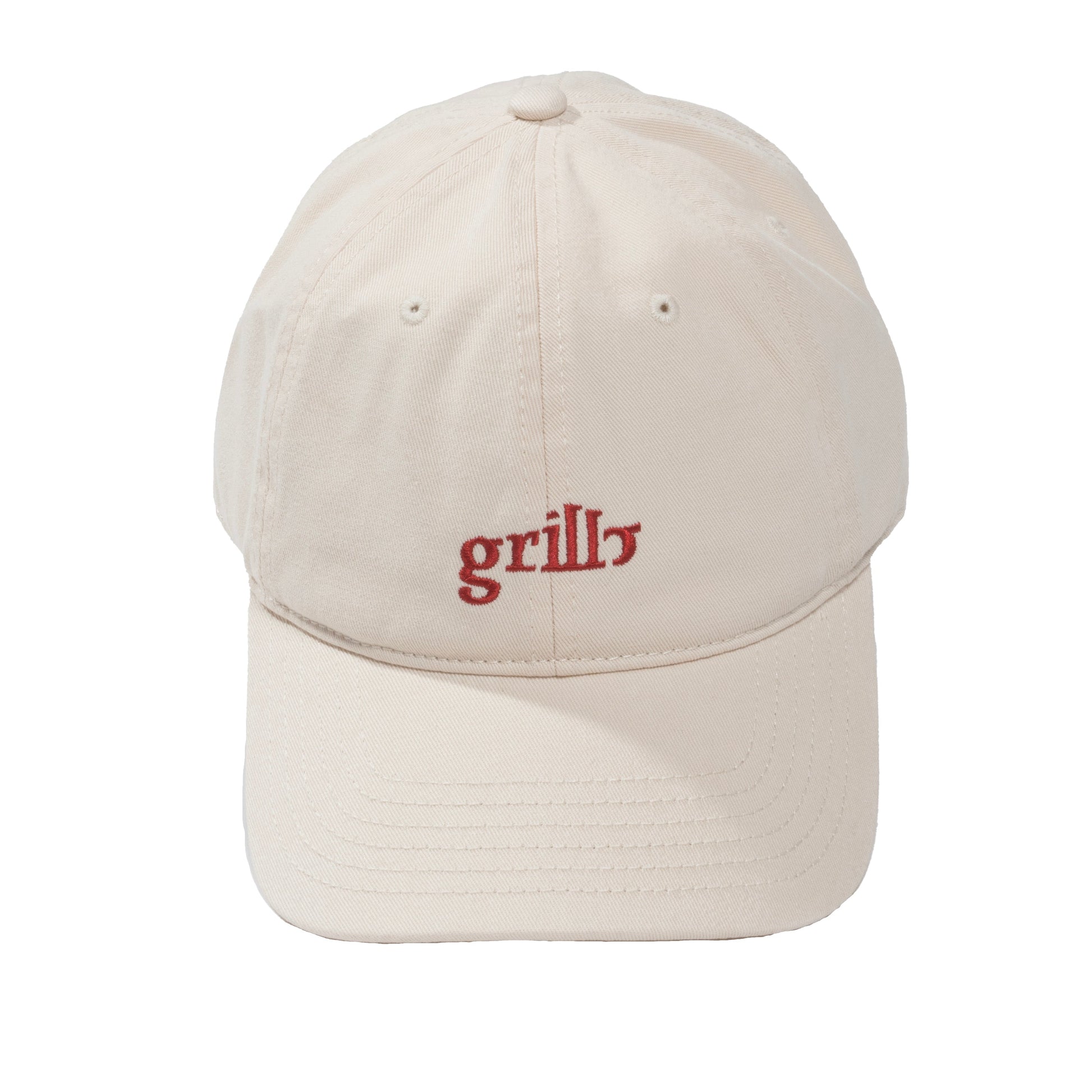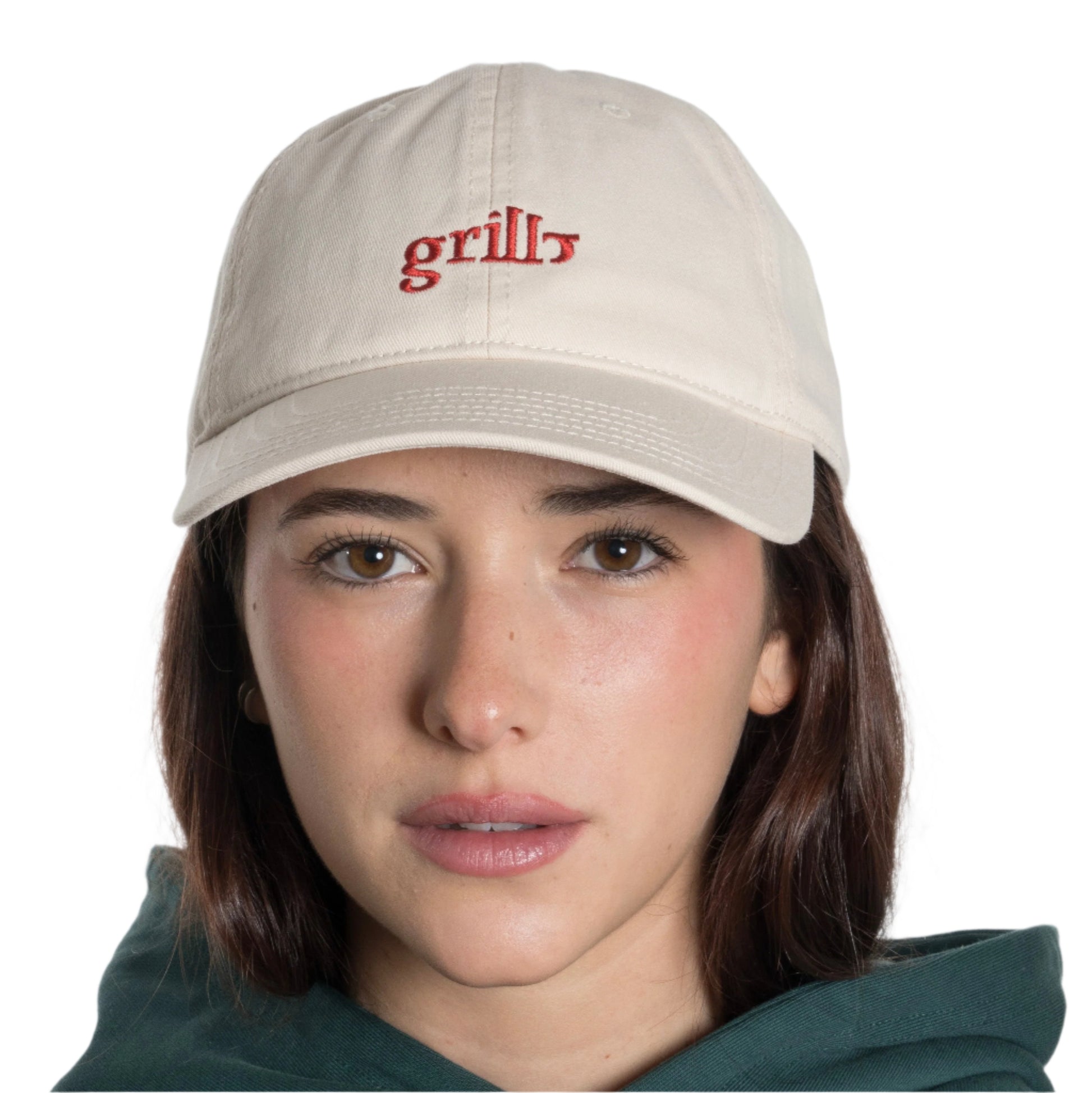 The first Grillo cap , a one-size-fits-all accessory available in two colors, blue and beige. The beige version with red embroidery and the blue version with white embroidery. Both feature a curved visor and the iconic "Cri Cri Fanatics" logo embroidered on the back.